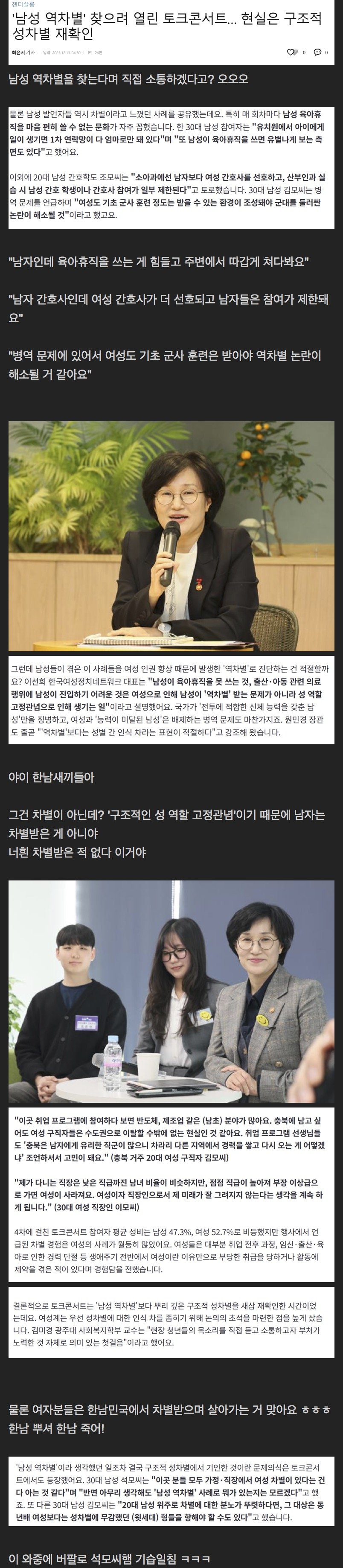 어제자 이삼대남 목소리 듣겠다며 토크콘서트 연 여가부 유머전문가 2025-12-14 08:56 546 0 목록 '남성 역차별' 찾으려 열린 토크콘서트… 현실은 구조적 성차별 재확인 | 한국일보