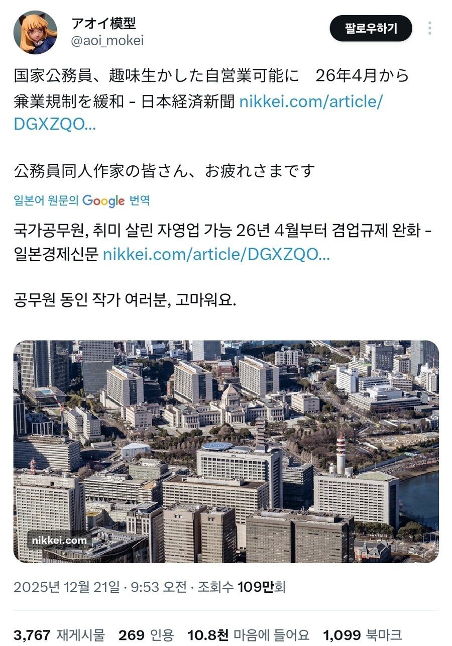 투잡 쌉가능.. 일본 공무원 근황 유머전문가 2025-12-21 21:02 580 0 목록 내년부터 공무원 본업에 영향을 주지 않는 선에서 본인의 취미를 활용한 사업 활동 하는 것을 허용. 유투버, 동인 작가, 웹 소설, 수제품 판매, 취미 레슨 등등이 거론 됨.